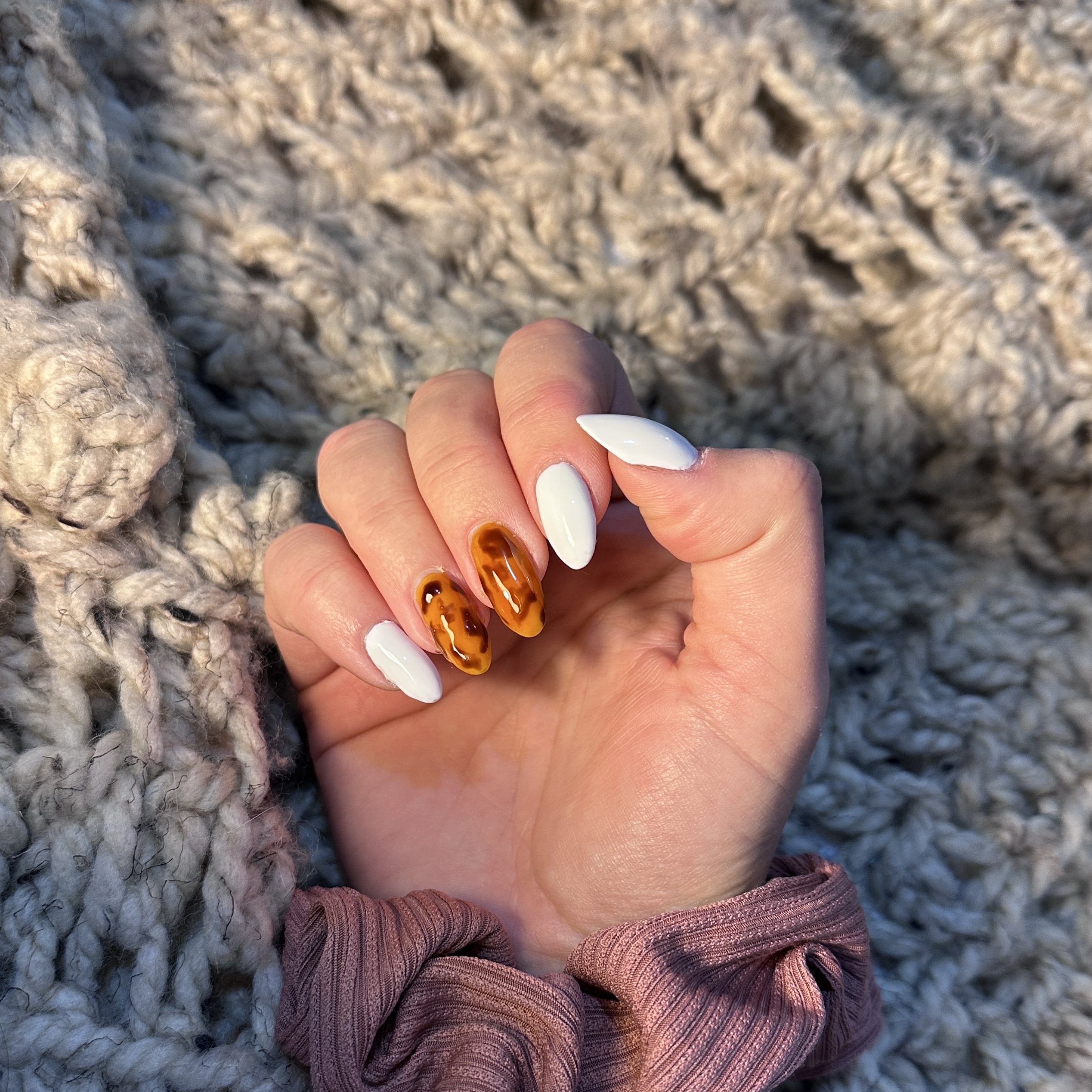 December 1, 2025; These nails were yet again inspired by a pintrest post, but the peralesant chrome I have isnt the best quality, so I just did plain white for some nails, and the tortoiseshell for the design.